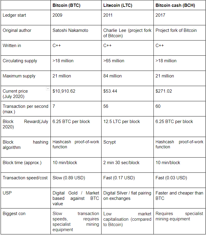 The following table presents the general comparison of the most important features of the three cryptocurrencies, at the time of writing of this paper (July, 2020). Bitcoin, as the oldest, has the biggest current price on the market making it a Digital Gold. Bitcoin and Bitcoin Cash use the same hashing algorithm, while LTC uses a different one.